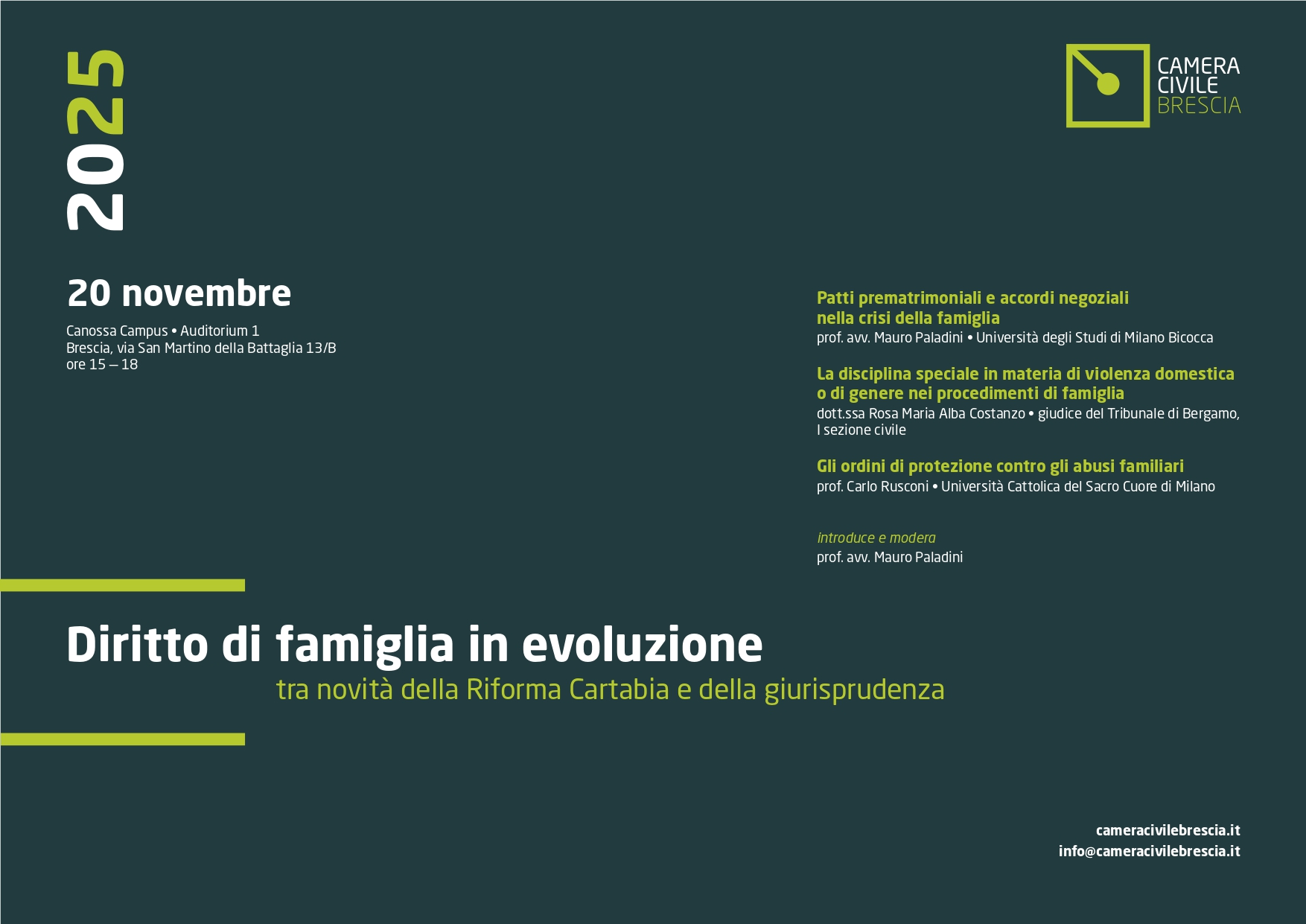 La Camera Civile di Brescia è un’associazione libera, non avente scopo di lucro, costituita nel distretto della Corte di Appello di Brescia. Ha lo scopo di promuovere in tutte le sedi l’adeguamento dell’ordinamento civile, sostanziale e processuale, alle esigenze della società e contribuire al migliore funzionamento della Giustizia Civile; mantenere alto il prestigio degli operatori; diffondere e sviluppare i principi della deontologia professionale sia nei rapporti con le parti che nella colleganza professionale; concorrere alla migliore tutela degli interessi di chi opera nello specifico settore professionale, nonché degli utenti della giustizia.